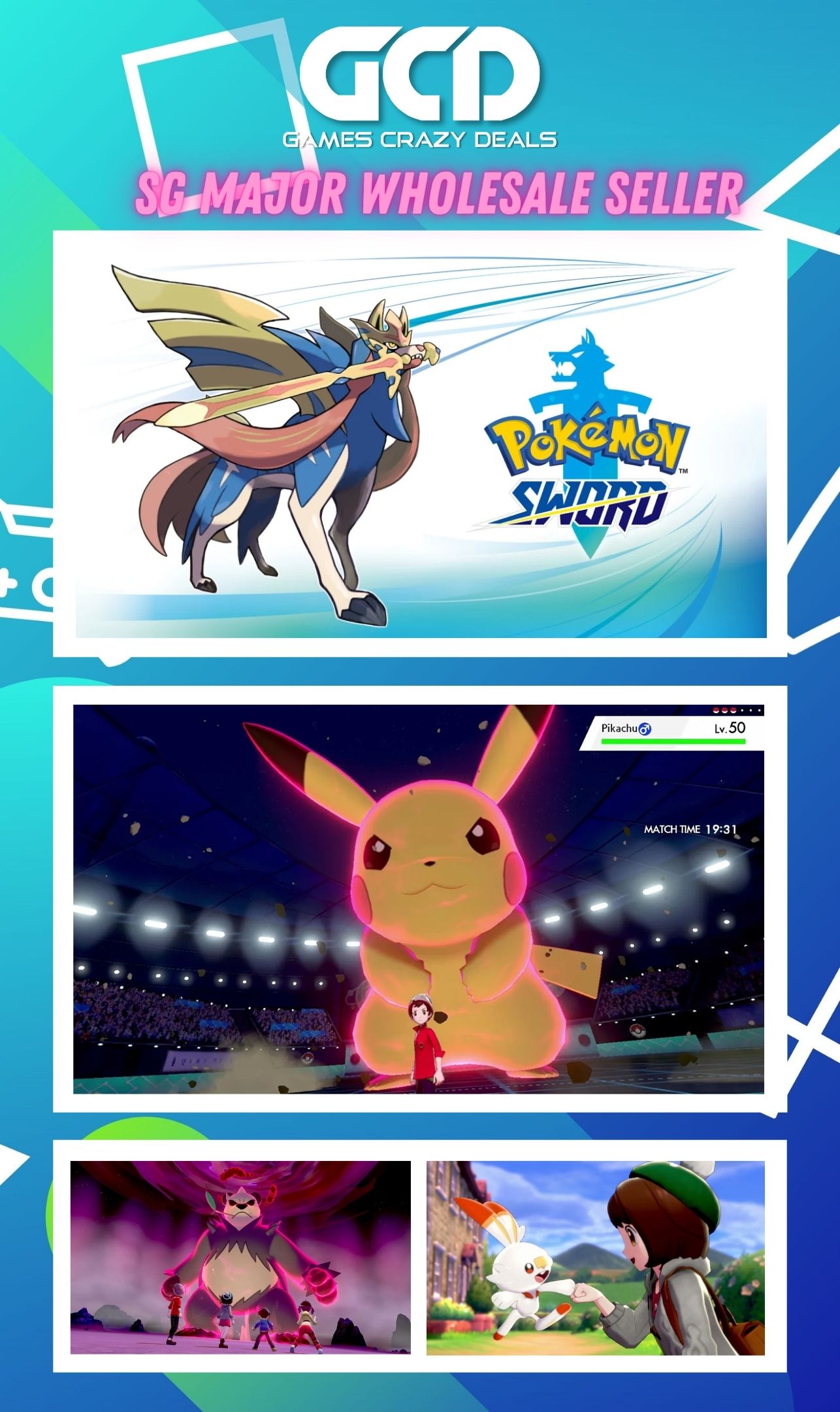 Become a Pokémon Trainer, embark on a new journey in the new Galar region, and unravel the mystery behind the Legendary Pokémon Zacian and Zamazenta! Explore the Wild Area, a vast expanse of land where the player can freely control the camera. And participate in Max Raid Battles*** in which players will face off against gigantic and super-strong Pokémon known as Dynamax Pokémon.Begin your adventure by choosing one of three new partner Pokémon: Grookey, Scorbunny, or Sobble and encounter new and familiar Pokémon as you catch, battle, and trade. Players can control the camera and explore the vast areas around them in the Wild Area. Team up with other players locally or online in the new multiplayer co-op Max Raid Battles. Trainers who possess the special item Dynamax Band can Dynamax their own Pokémon. Get ready for the next Pokémon adventure in the Pokémon™ Sword and Pokémon™ Shield games.