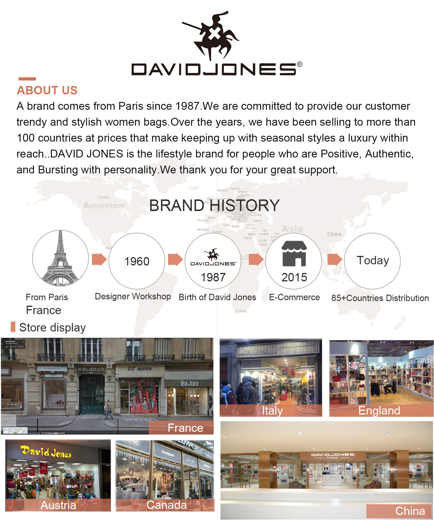 - DAVIDJONES , a brand comes from Paris since 1987.We are committed to provide our customer trendy and stylish women bags.Over the years, we have been selling to more than 100 countries at prices that make keeping up with seasonal styles a luxury within reach.DAVID JONES is the lifestyle brand for people who are Positive, Authentic, and Bursting with personality.We thank you for your great support.